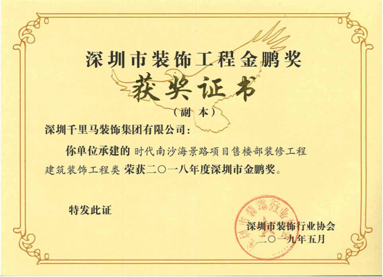 我司承建的僑城坊1棟21層辦公室裝修工程、時(shí)代南沙海景路項(xiàng)目售樓部裝修工程、艾美國際商學(xué)院裝飾工程三項(xiàng)目,經(jīng)深圳市裝飾行業(yè)協(xié)會(huì)的專家組嚴(yán)格審核,均獲得了2018年度深圳市裝飾工程“金鵬獎(jiǎng)”。其中,僑城坊1棟21層辦公室裝修工程,經(jīng)廣東省建筑業(yè)協(xié)會(huì)組織的專家組嚴(yán)格審核,榮獲了2019年廣東省優(yōu)秀建筑裝飾工程獎(jiǎng)。 金鵬獎(jiǎng)——時(shí)代南沙海景路項(xiàng)目售樓部裝修工程 金鵬獎(jiǎng)——艾美國際商學(xué)院裝飾工程 金鵬獎(jiǎng)——僑城坊1棟21層辦公室裝修工程 金鵬獎(jiǎng)獎(jiǎng)杯 廣東省優(yōu)秀建筑裝飾工程獎(jiǎng)——僑城坊1棟21層辦公室裝修工程 深圳千里馬裝飾集團(tuán)將不忘初心,砥礪前行,不斷堅(jiān)持“工匠精神”不動(dòng)搖,把品質(zhì)、工期和客戶滿意度永遠(yuǎn)放在第一位,為客戶創(chuàng)造價(jià)值,為裝飾行業(yè)注入不竭動(dòng)力。