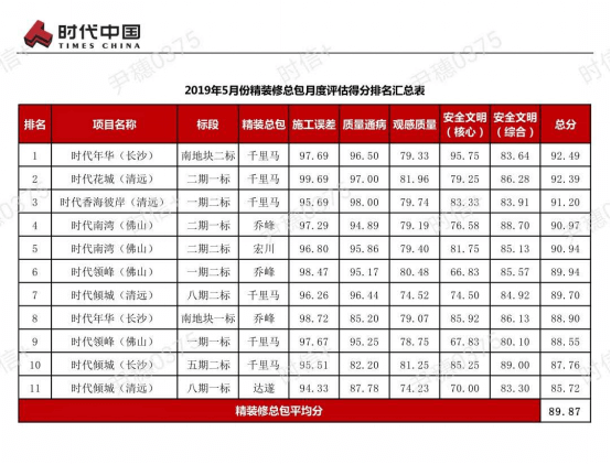 時(shí)代中國成立于1999年,是在香港上市的總部位于廣州的知名開發(fā)商。時(shí)代中國一直深耕珠三角,輻射全面,年銷售額今年計(jì)劃超千億!對(duì)品質(zhì)要求非常高!對(duì)安全文明施工、實(shí)測(cè)實(shí)量、交付評(píng)估、售后服務(wù)都非常重視。專門聘請(qǐng)?jiān)跇I(yè)內(nèi)非常嚴(yán)格的第三方評(píng)估公司——深圳市瑞捷建筑工程咨詢有限公司,對(duì)項(xiàng)目整個(gè)過程進(jìn)行評(píng)估與監(jiān)督。 深圳千里馬裝飾集團(tuán)本著“專業(yè)鑄造精品,服務(wù)提升價(jià)值”的精神,把客戶放在第一位,認(rèn)認(rèn)真真抓落實(shí)、認(rèn)真落實(shí)客戶指令。緊抓“工匠精神”不動(dòng)搖,施工質(zhì)量和現(xiàn)場(chǎng)安全文明施工逐步提升。 作為時(shí)代中國的精裝修戰(zhàn)略合作供應(yīng)商,我司項(xiàng)目包攬時(shí)代中國2019年5月月度評(píng)估前三名!可喜可賀,只要我們重視、認(rèn)真,取得好成績(jī)應(yīng)是理所當(dāng)然!恭喜獲得好成績(jī)的項(xiàng)目小伙伴,感謝獲得好成績(jī)的小伙伴,你們?yōu)楣救〉昧藰s譽(yù),公司全體同事以你們?yōu)榘粒? 千里馬裝飾集團(tuán)實(shí)行“奮斗者文化”,急招有志之士加盟千里馬,你的奮斗和付出將會(huì)獲得公司巨大的支持以及豐厚的回報(bào)。 深圳千里馬裝飾集團(tuán)人力資源部,電話號(hào)碼:0755-26756366,千里馬裝飾期待您的加入。