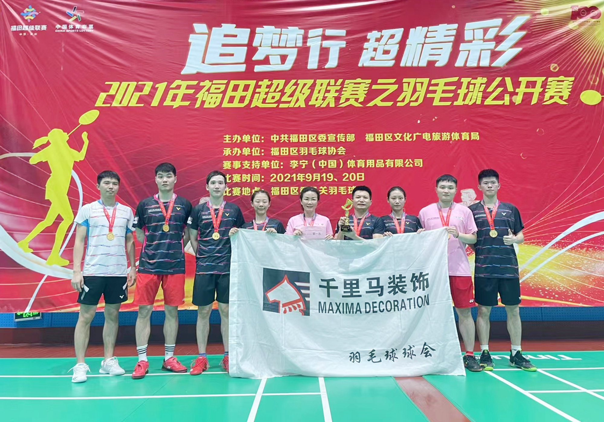 9月19日上午,2021福田超級聯賽之羽毛球公開賽在福田區委羽毛球館開打。本次比賽由中共福田區委宣傳部、福田區文化廣電旅游體育局主辦,福田區羽毛球協會承辦。比賽執行中國羽毛球協會審定的最新2020版羽毛球競賽規則。但在合法發球的判罰上不使用固定高度發球規則。本次比賽吸引深圳市48支隊伍共432名運動員報名參加,參賽隊伍來自全區多個企事業單位、俱樂部、社區、社團等。     比賽分為業余青年組、業余中年組兩個組別,均進行混合團體賽。業余青年組混團賽共有比賽項目設置3項,分別為第一男子雙打、女子雙打、第二男子雙打;業余中年組混團賽同樣進行3場比拼,項目設置分別為第一混合雙打、男子雙打、第二混合雙打。業余青年組于9月19日完成所有比賽,決出冠軍。業余中年組的比賽于9月20日進行,并在當日決出冠亞軍。   男子雙打賽中,李向東董事長殺球得分,擴大球隊奪冠優勢。     千里馬羽毛球球會在李向東董事長的親自指揮、帶領下,通過精心的備戰、科學的人員安排,以高超的競技水平一路過關斬將,最終包攬青年組、中年組冠軍,一騎絕塵。   千里馬羽毛球球會中年組奪冠合影     千里馬羽毛球球會青年組奪冠合影