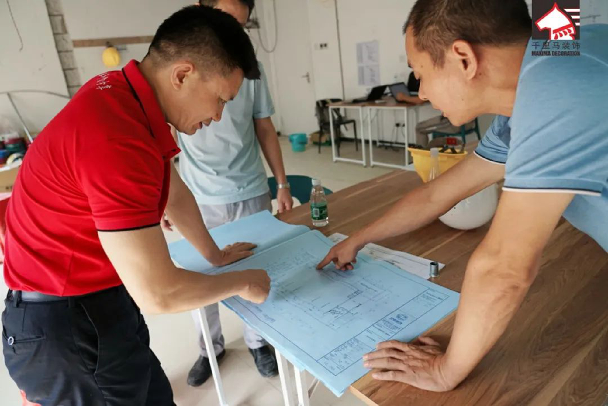 董事長李向東和項目經理鄭權在討論工藝