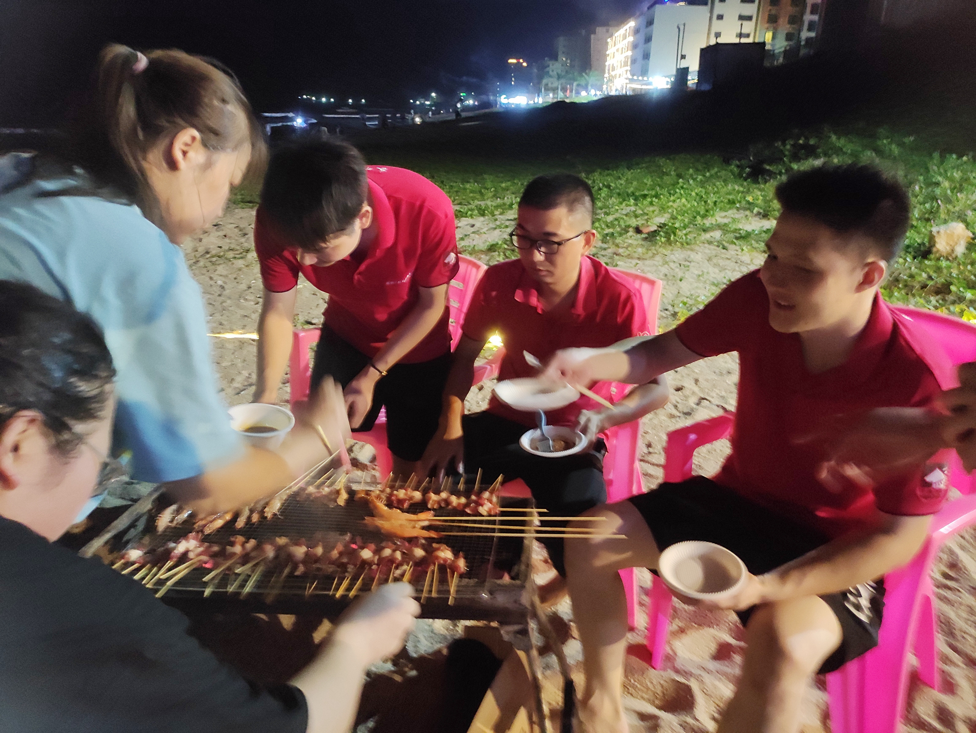 激動(dòng)的戶外拓展過(guò)后,已經(jīng)是傍晚時(shí)分,是時(shí)候準(zhǔn)備一頓別樣的晚餐了。于是三五人洗菜切菜,八九人圍坐穿串,往日嚴(yán)肅少言的領(lǐng)導(dǎo),這一刻和大家一樣,都是穿串的“手工藝人”。
