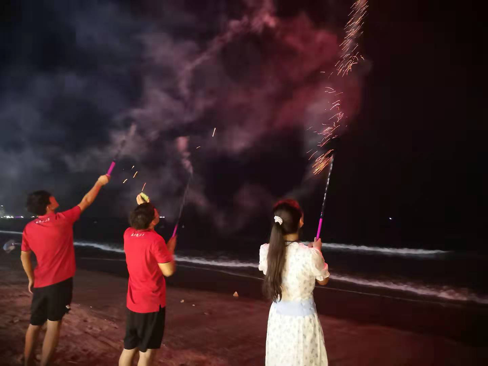 當(dāng)煙花的背景從疊疊幢幢的房子切換成無(wú)邊無(wú)際的黑夜和此起彼伏的浪濤,當(dāng)放煙花的人從形單影只到三五成群,所有的塵雜瑣事在那一刻都隨浪濤走遠(yuǎn)。而此刻與我們一起放煙花的人,一定也會(huì)與我們一起共同燦爛!